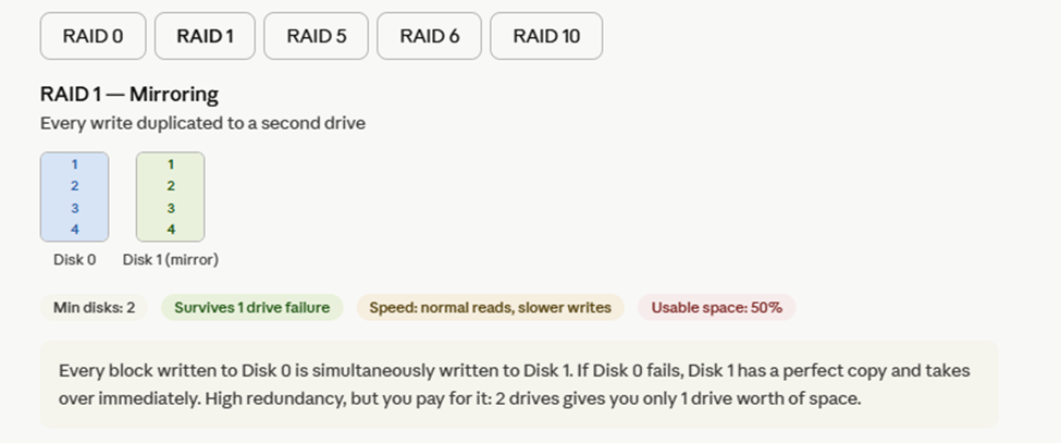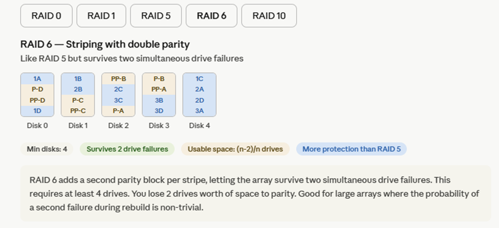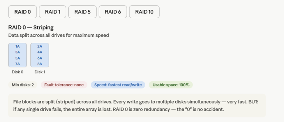 Now here's the interactive RAID visual — click through each level to see how the disks are organized and what the failure tolerance is: