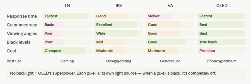 Here's a visual to lock in the TN vs IPS vs VA vs OLED tradeoffs — this comes up in scenario questions about which display to choose:
