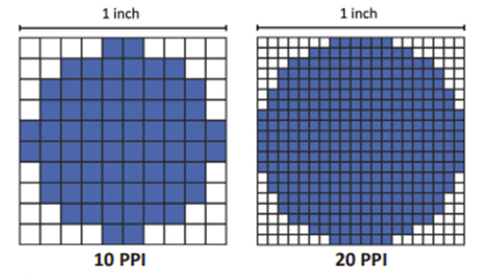 Higher PPI = sharper, clearer image. Lower PPI = visible individual pixels ("pixelation").