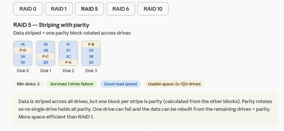 RAID 5 — stripe + 1 parity, 1 drive can fail, needs 3+ drives