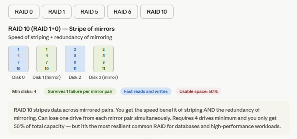 RAID 10 — stripe of mirrors, best performance + redundancy, 50% usable space, needs 4+ drives