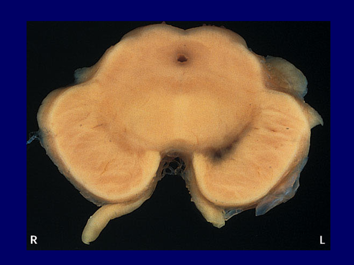 The blackened area in this cross section of the midbrain is a source of dopaminergic neurons that project to the basal ganglia. When these neurons die, behavior is inhibited.