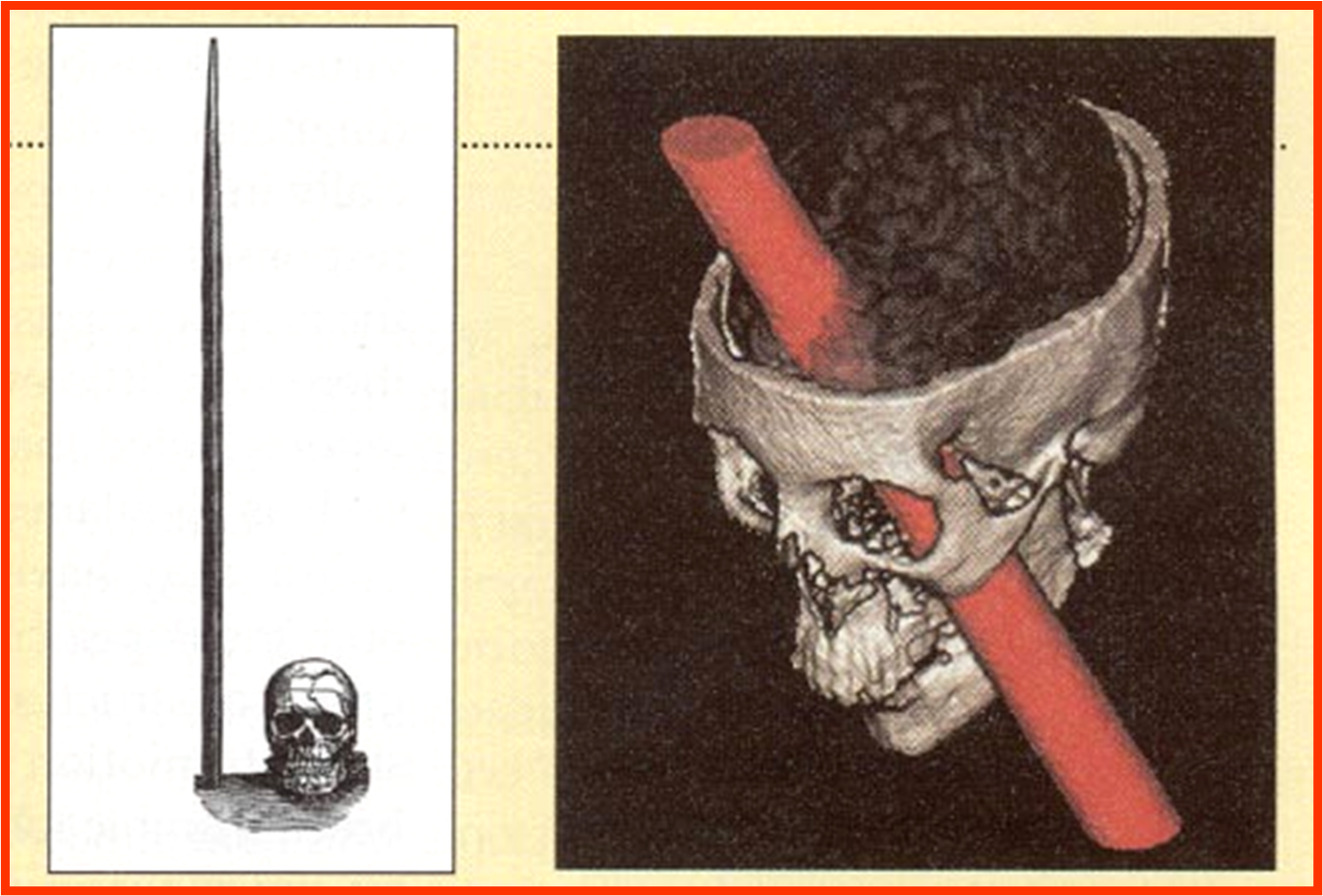 A railroad worker, named Phineas Gage, had a metal spike pierce his orbit and obliterate his left eye and the anterior part of his frontal lobes from a demolition explosion. Phineas’s personality completely changed from before the injury. He more aggressive and had difficulty with doing his job as a railroad worker