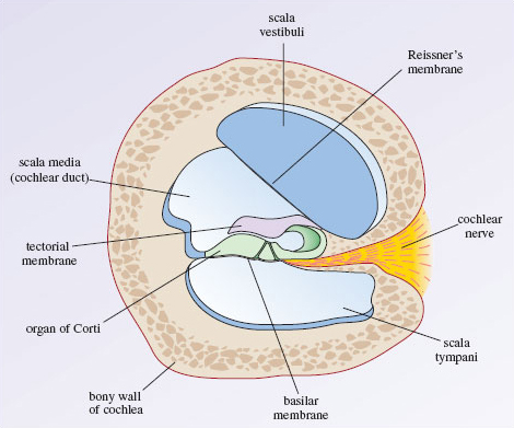 Organi of corti. low potassium (K+), high sodium (Na+), similar to perilymph