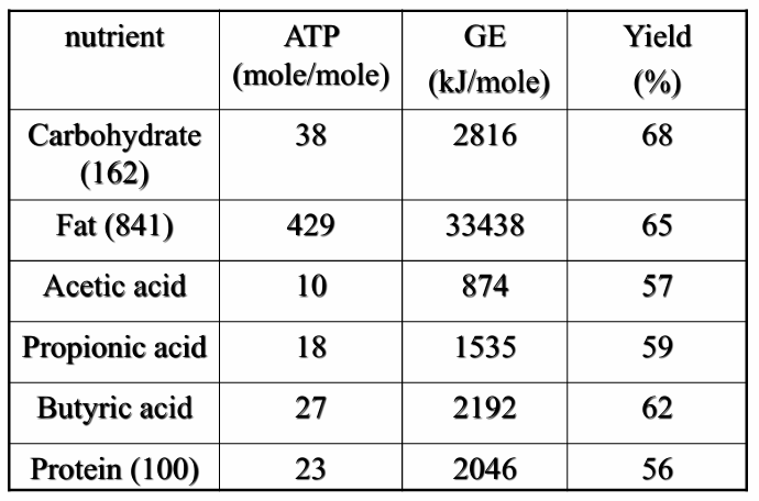 Carbohydrate and fat show ATP yield higher than that of volatile FA and protein