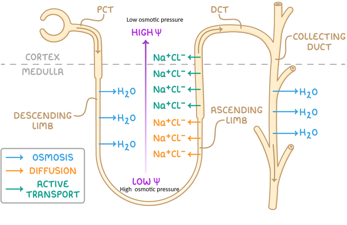 Ascending limb: impermeable to water but actively pumps Na+ out → filtrate gets diluted→ creates high osmolality → hyptertonic environment (= higher osmotic pressure)