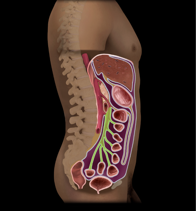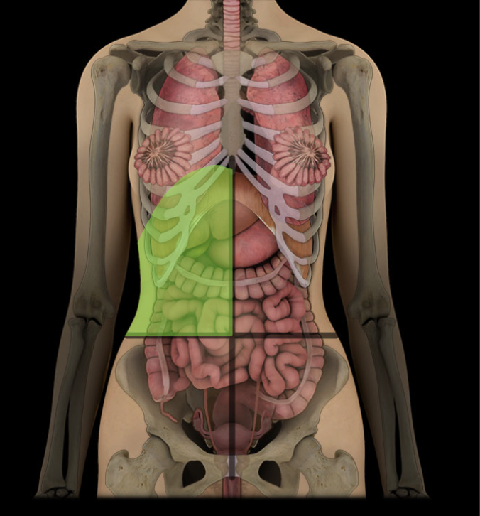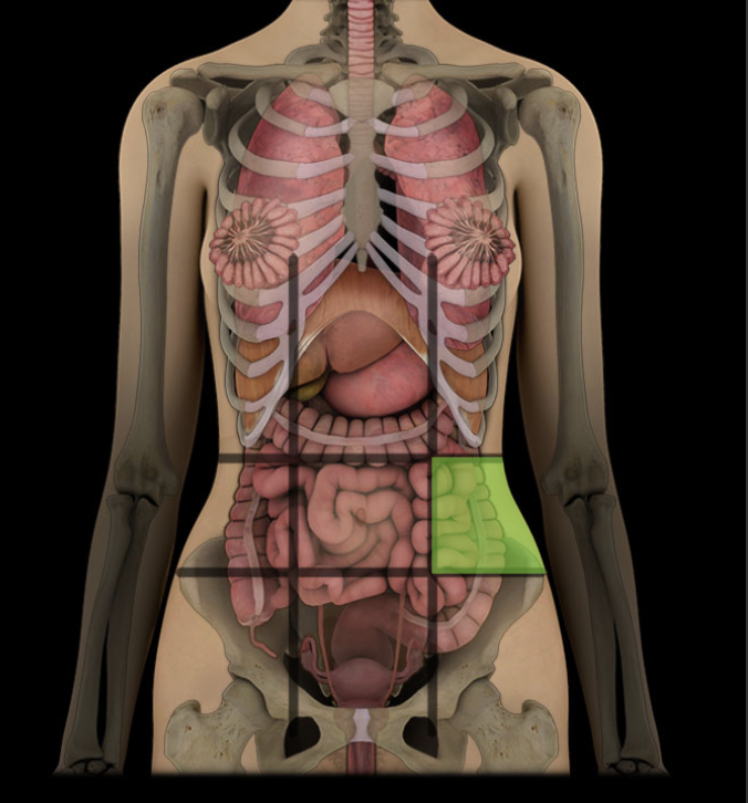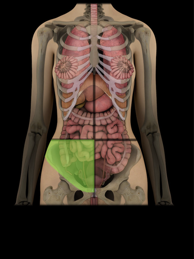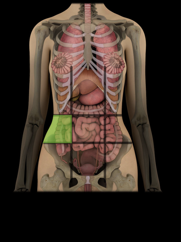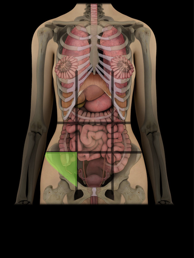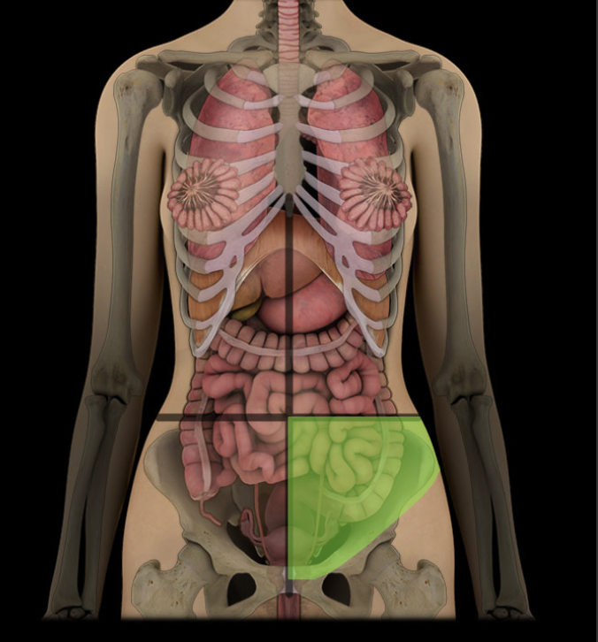 Contents include parts of large intestine, liver and gallbladder, and right kidney