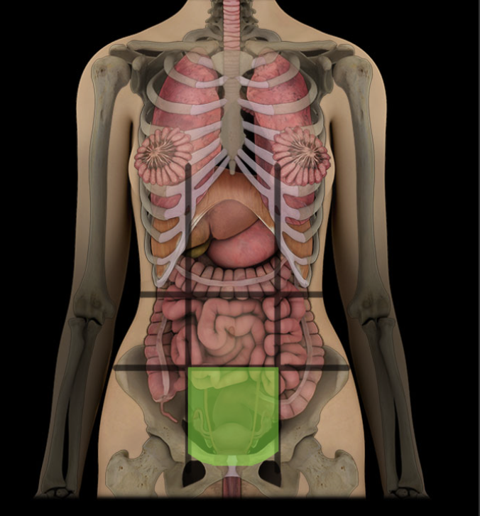 Contents include urinary bladder (when distended), and parts of small and large intestines