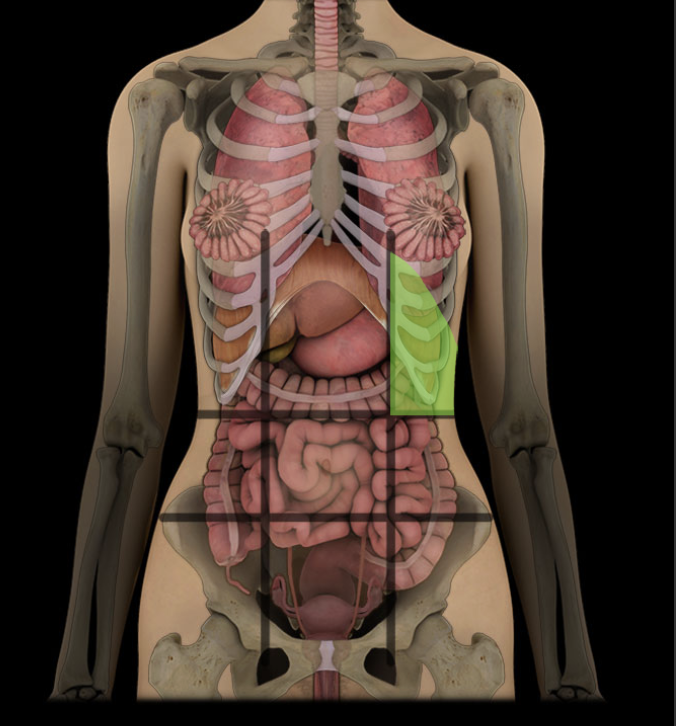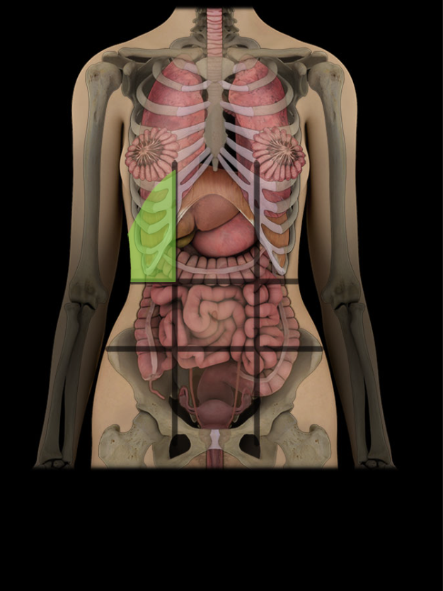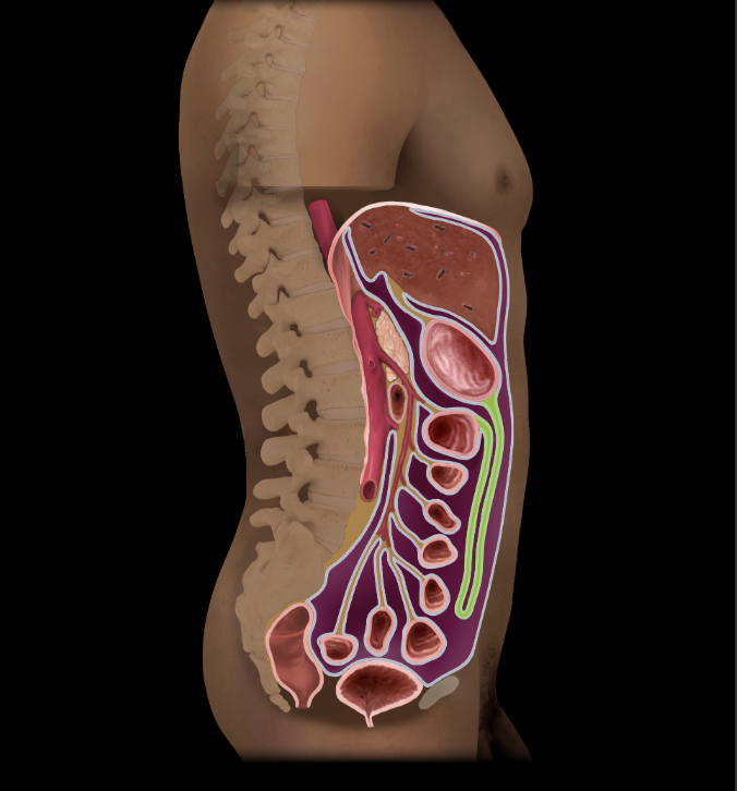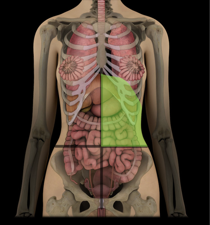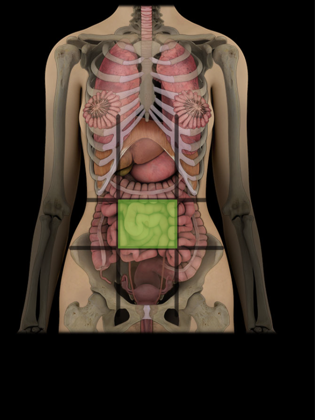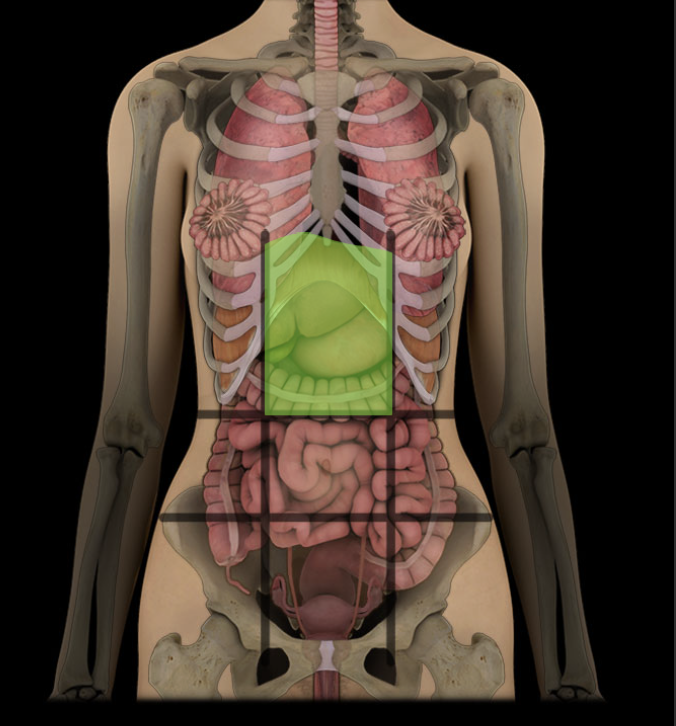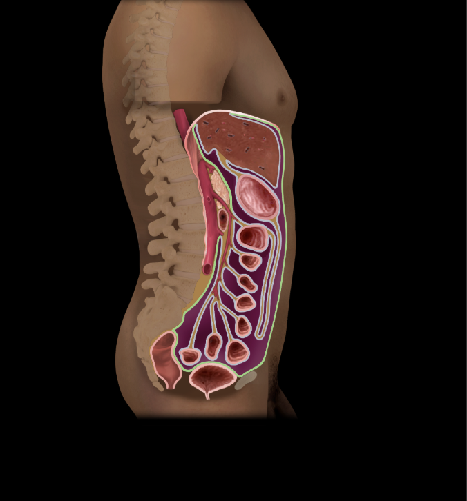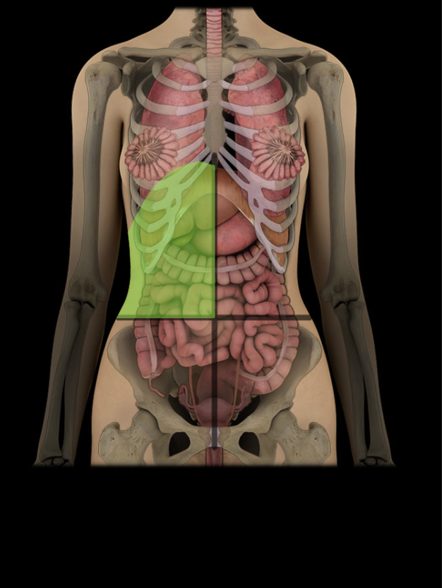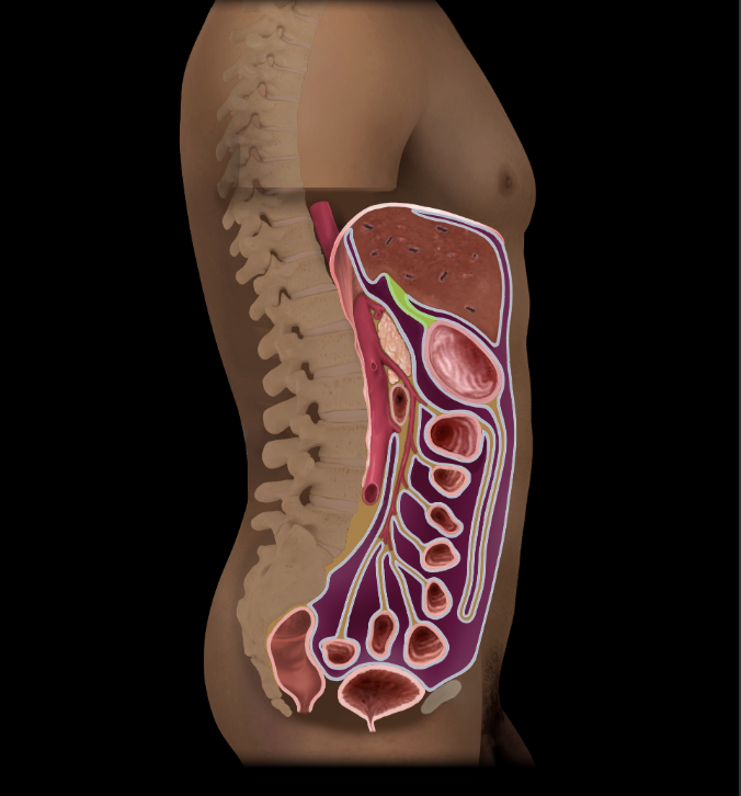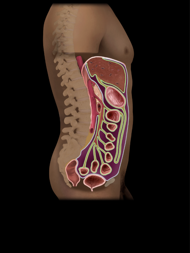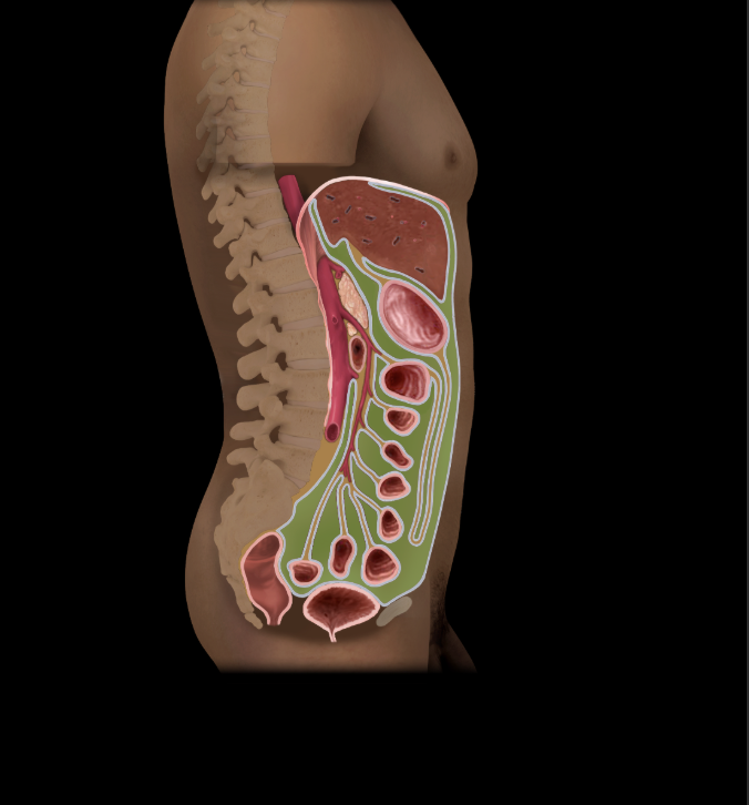 Major organs include: stomach, intestines, liver, gallbladder, spleen, pancreas, kidneys and ureters, suprarenal glands, aorta, inferior vena cava, and lumbar nerve plexus