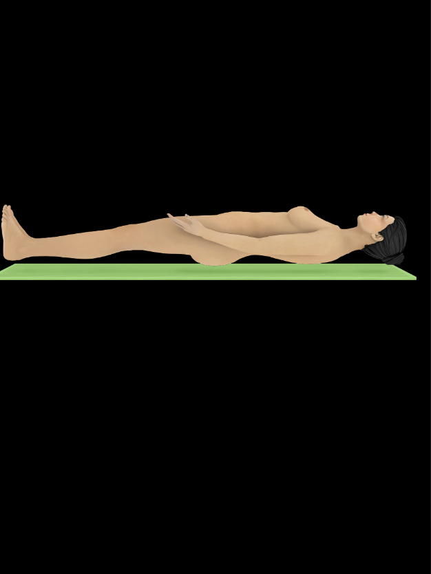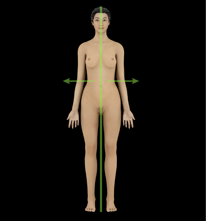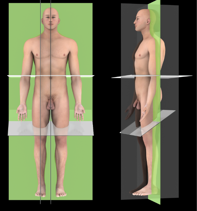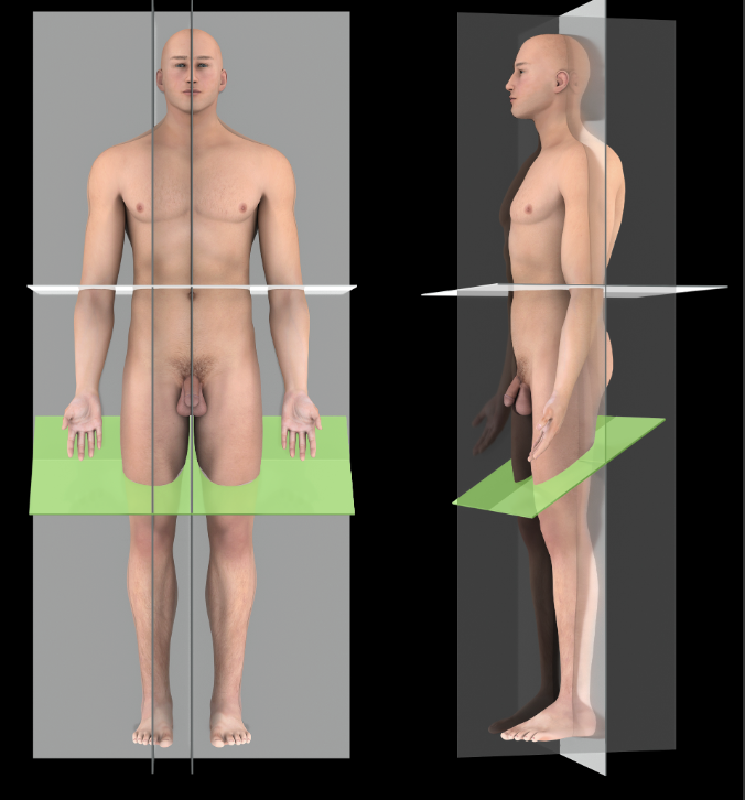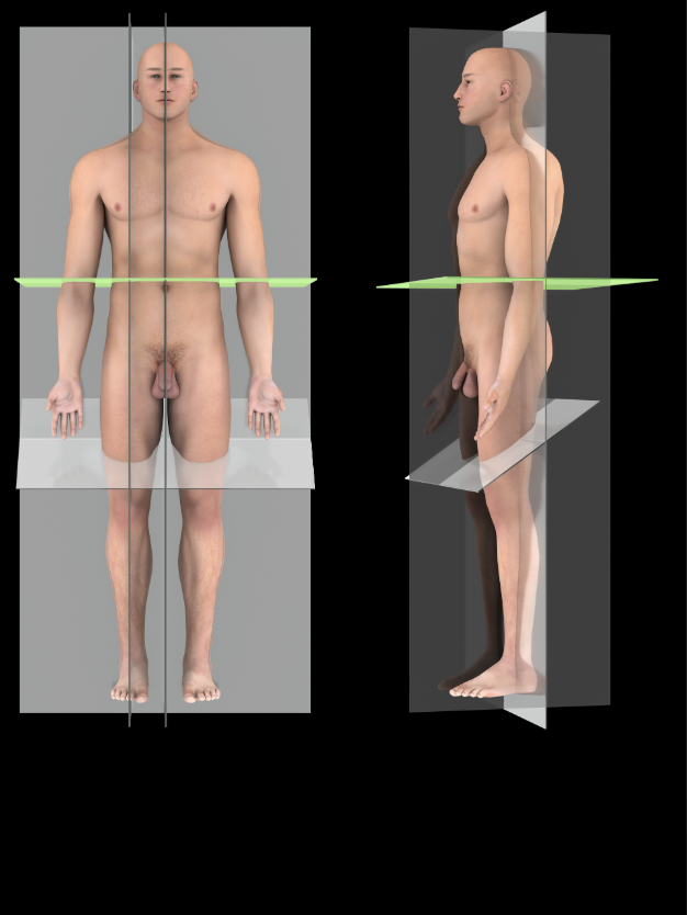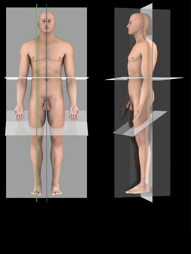 An individual in anatomical position is standing erect with arms at sides, palms facing forward with fingers pointing downward, feet parallel to each other and flat on the floor, and eyes directed forward