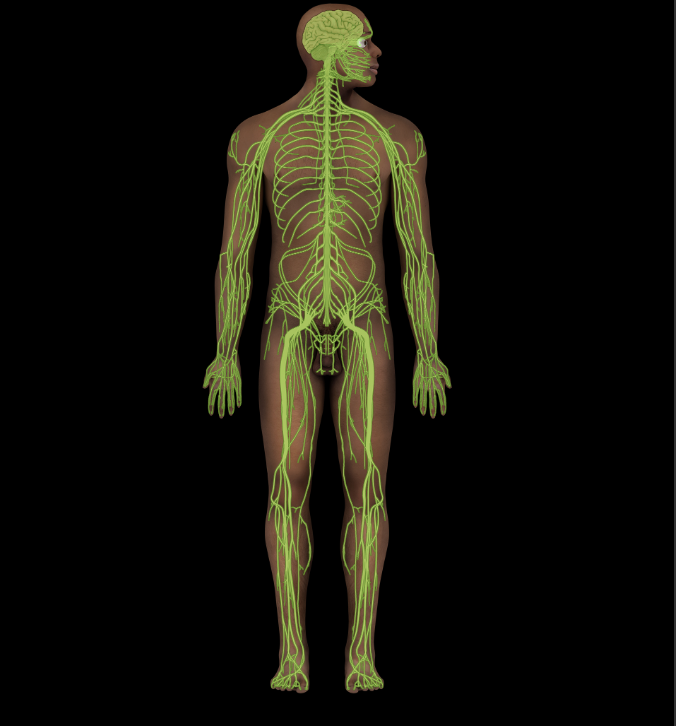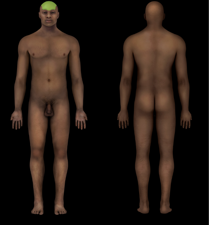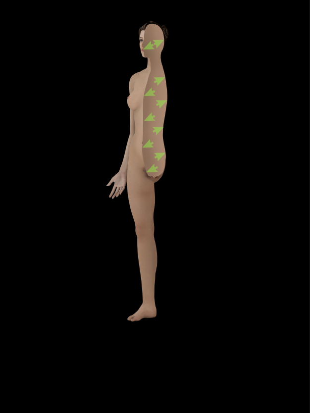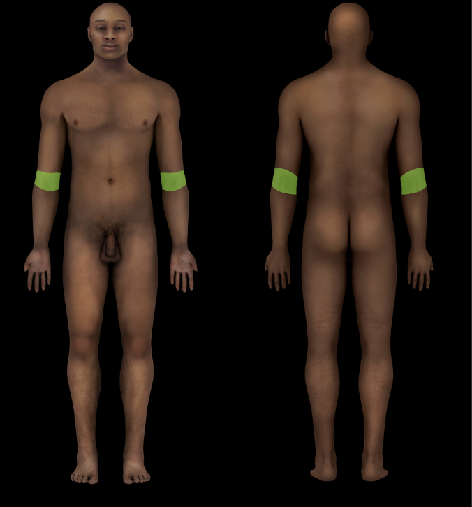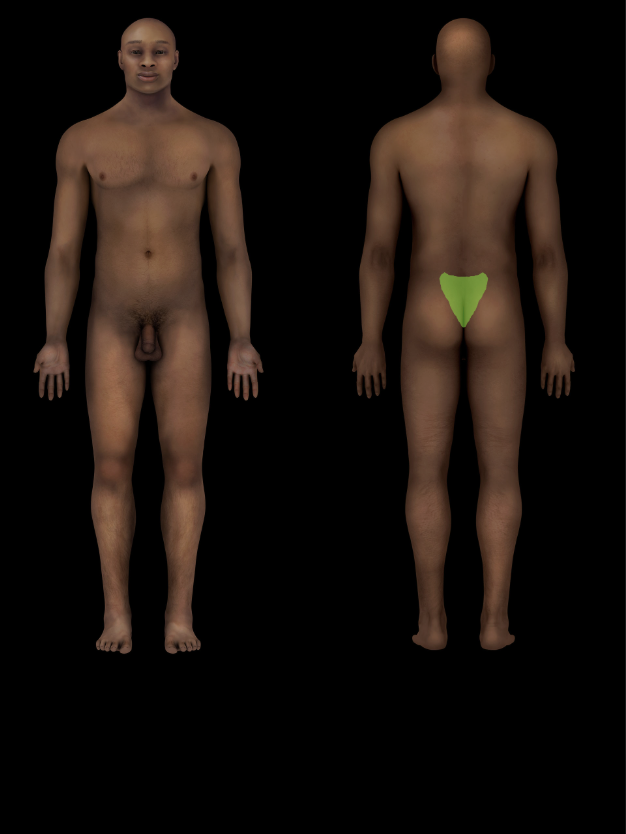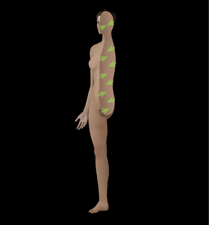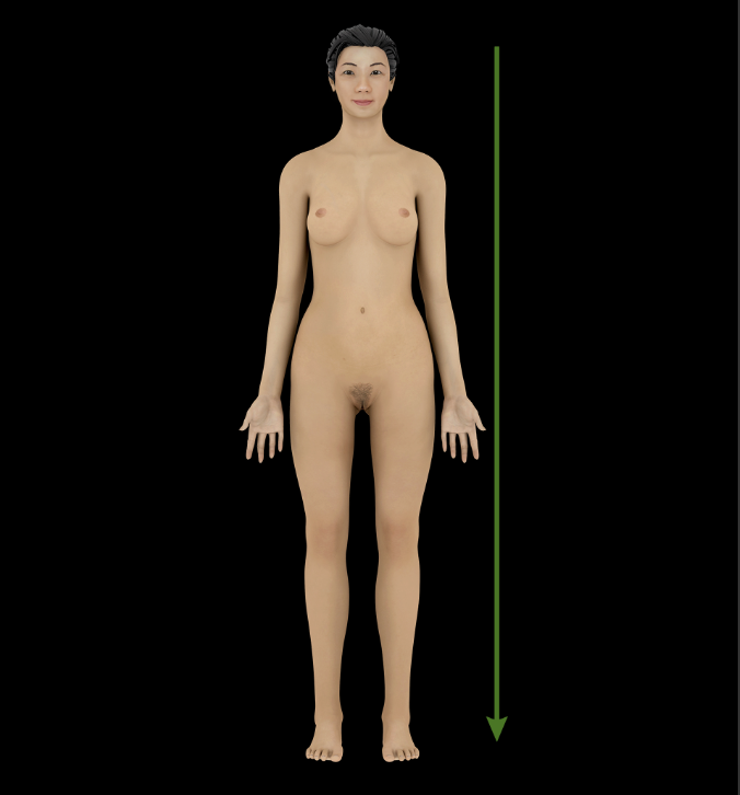 An individual in anatomical position is standing erect with arms at sides, palms facing forward with fingers pointing downward, feet parallel to each other and flat on the floor, and eyes directed forward