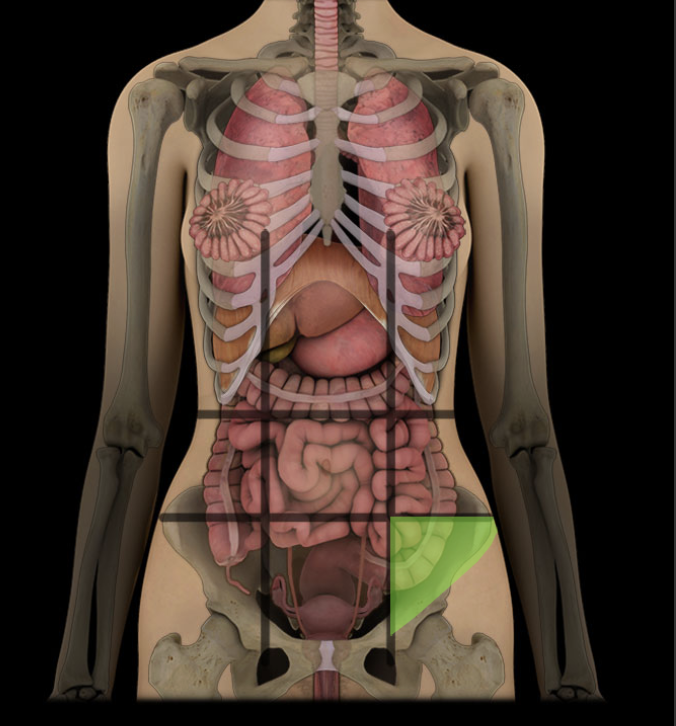Contents include parts of small intestine, large intestine (including cecum and vermiform appendix), urinary bladder (when distended), and right uterine tube and ovary