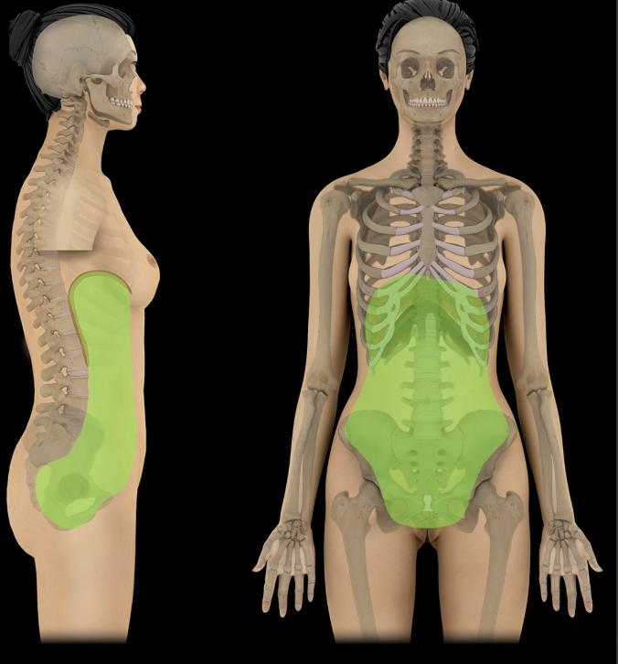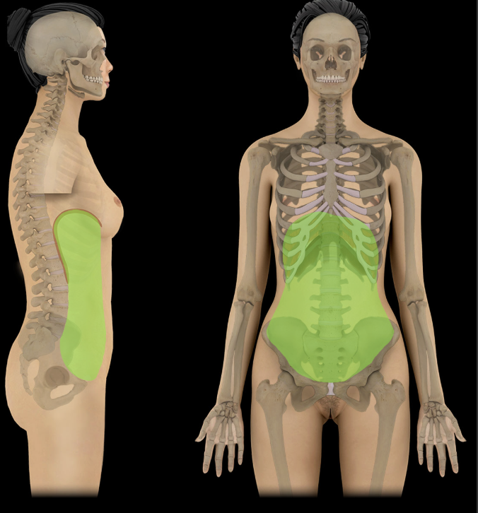 Bounded by abdominal walls, thoracic diaphragm (superior), and pelvic brim (inferior)