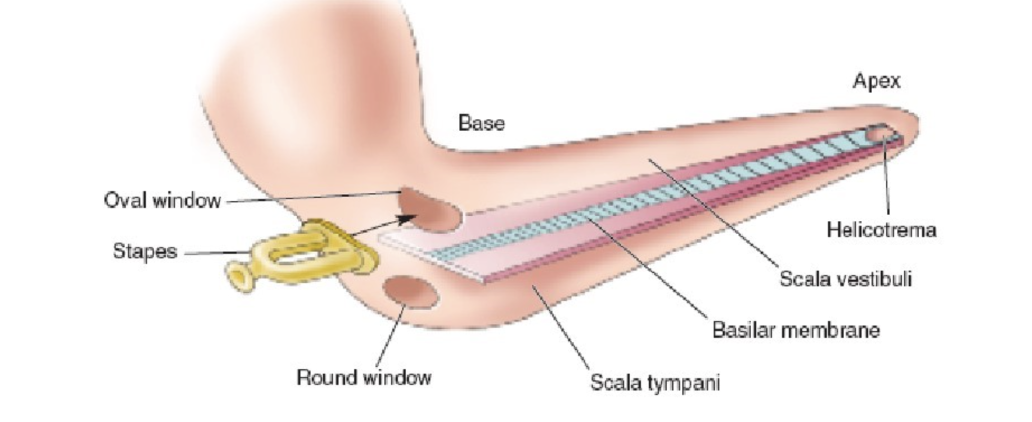 the wavelength sent along the basilar membrane is amplified (large wavelength)