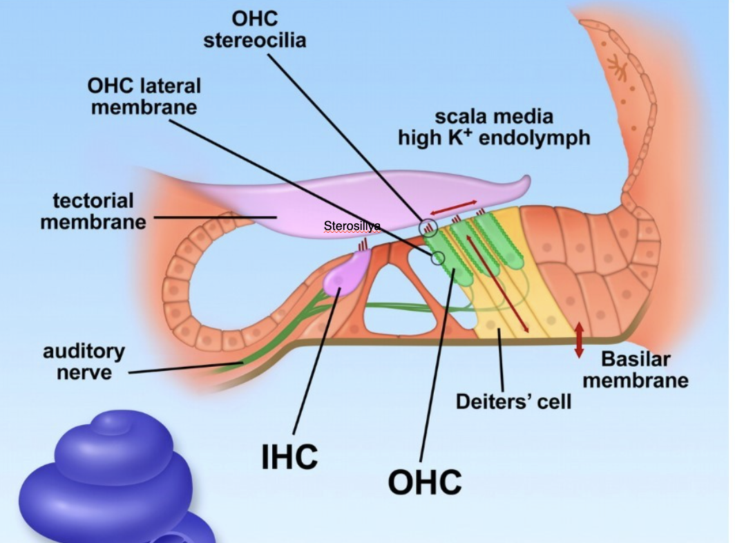 inner hair cells (send info to brain), OHCs have a motor protein called prestin in their membrane