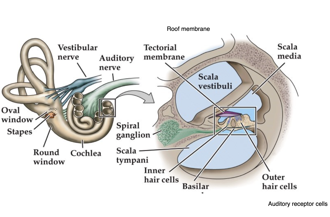 from the spiral ganglion, it goes through the CN VII (cochlear nerve)