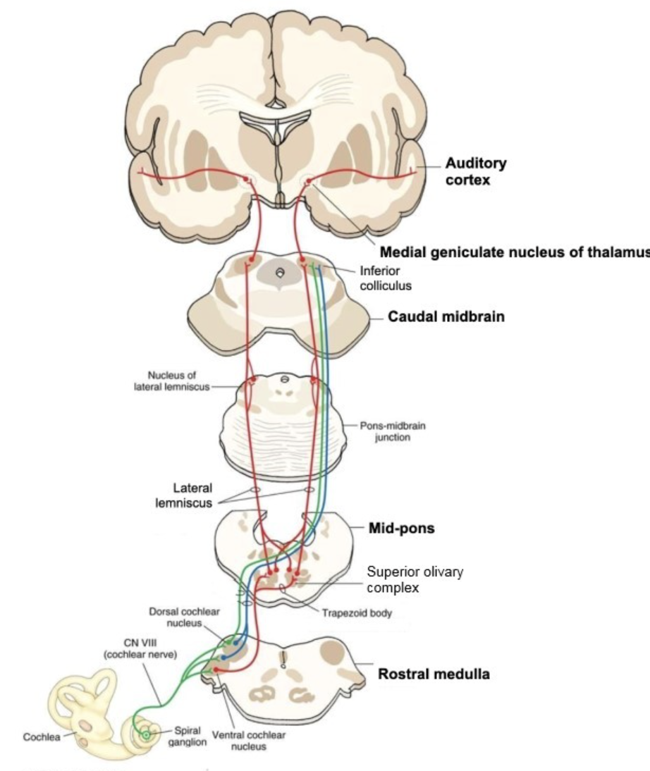 cochlear nerve → cochlear nuclei → superior olive → inferior colliculus → thalamus (MGN) → auditory cortex