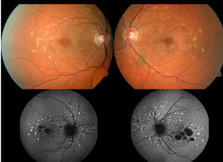 What do you see here? These are 2 diff conditions (one on left has a colour fundus version above and FAF version helping see lesion better, and same for right):