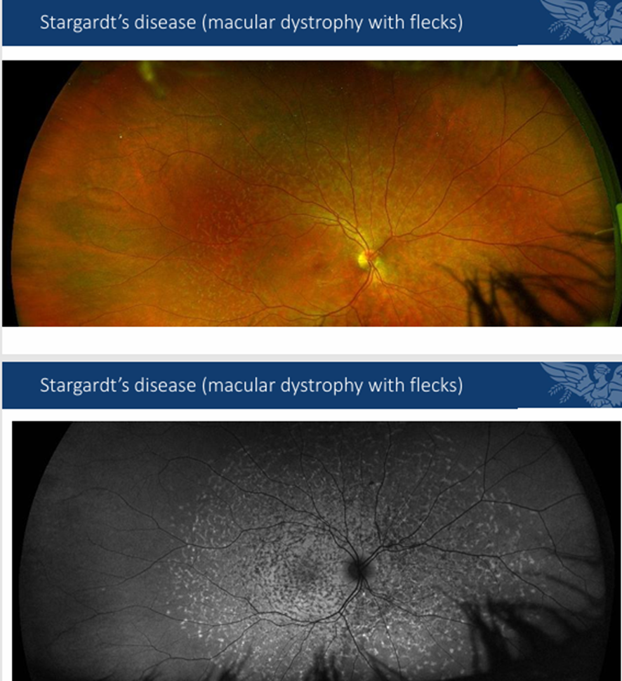 Can occur with or without flecks (e.g., Stargardts = with flecks).