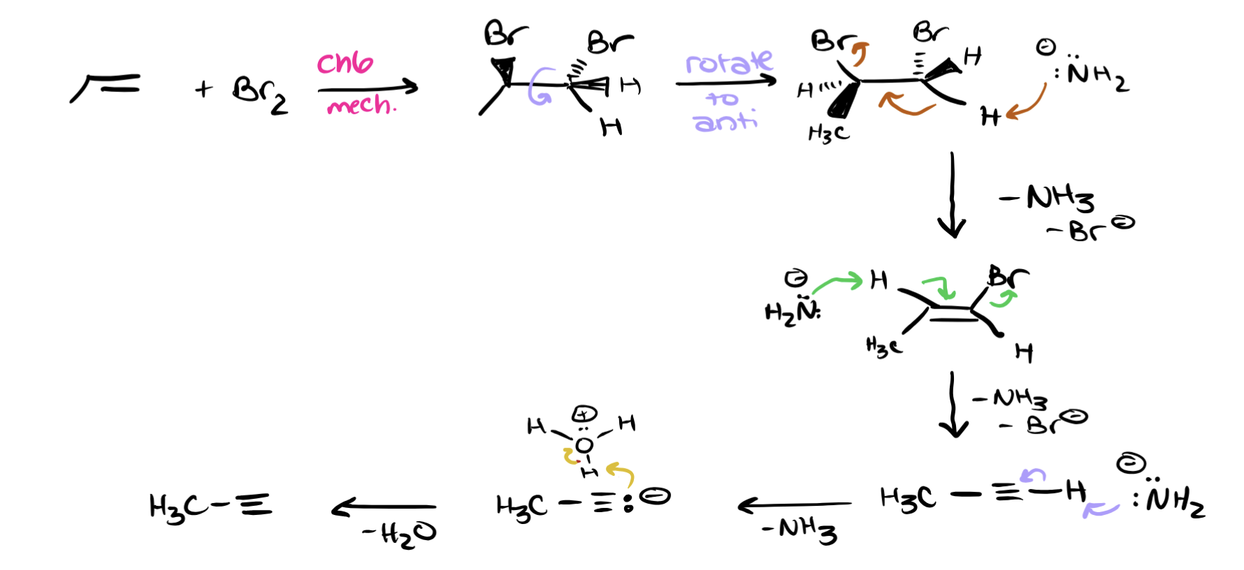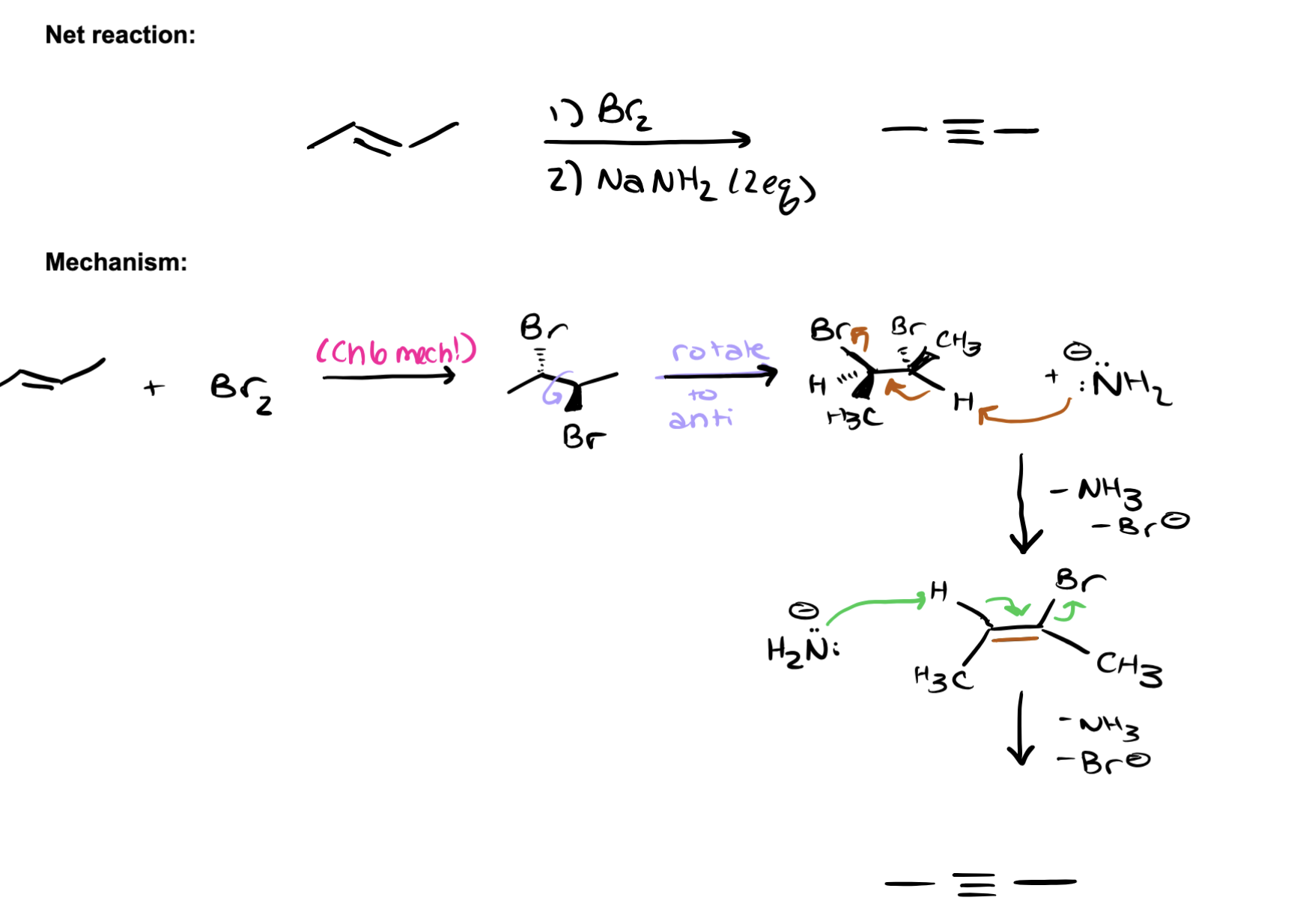 starts with alkane, add BR2 (ANTI or one pointing out one in), NaNH2 attacks H, electrons/arrow move to double bond, kicks BR2 off - do it again to get internal alkyne // 💥 ONE-LINE MEMORIZATION EXAM VERSION