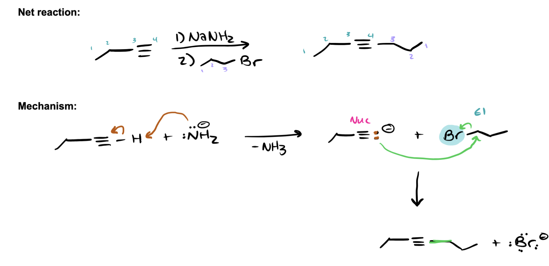 starts: terminal alkyne products: alkyl halide (Br2) and strong base (NaNH2) STEP 1 (Carbocation): NaNH2 deproponates terminal alkyne forming carbocation STEP 2 (Nucelophile attack to form internal alkyne): Br2 (EL) is attacked by carbocation (Nucl) to form new bond and results in internal alkyne.