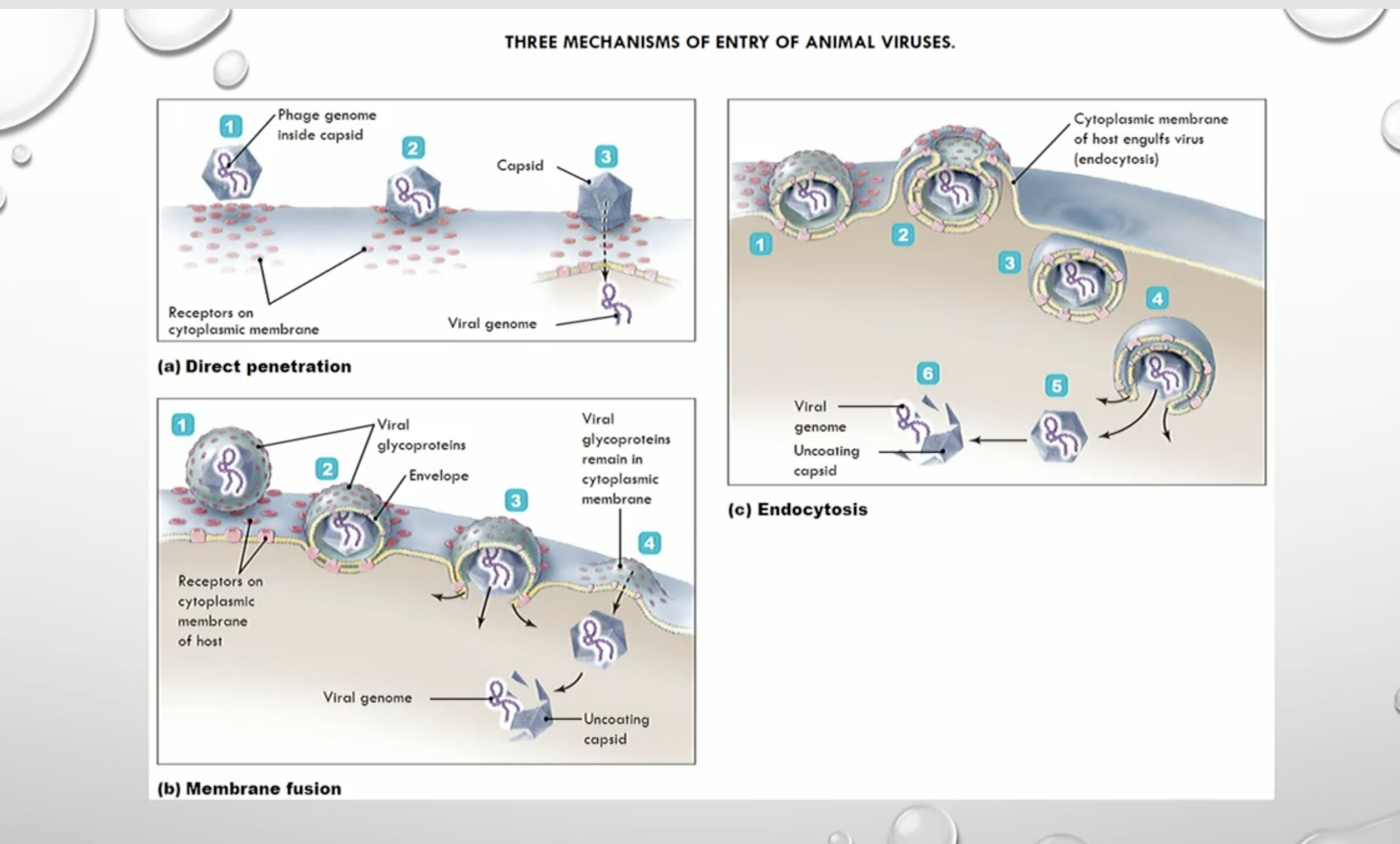 → Cell engulfs virus into vesicle → uncoating releases genome