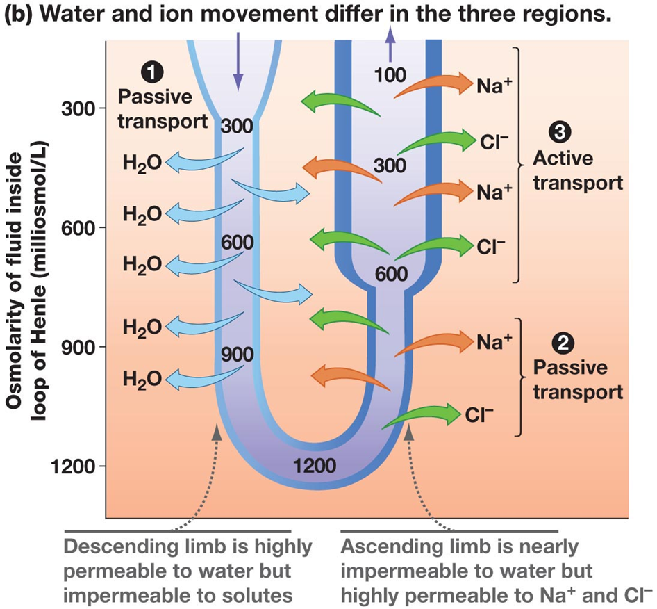 during steps 2 and 3, the concentration decreases as the solutes (Na+ and Cl-) decrease (get resorbed)