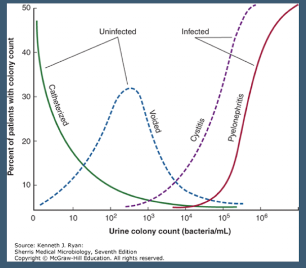 A voided urine sample shows a colony count near 10^5 bacteria/mL. What type of infection does this count range typically suggest