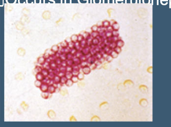 Glomerulonephritis; resulting from grouped RBCs leaking through damage of the glomerular basement membrane