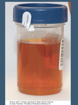 Hemoglobinuria (RBC are lysed) or Myoglobinuria. (muscle breakdown, kidney injury)