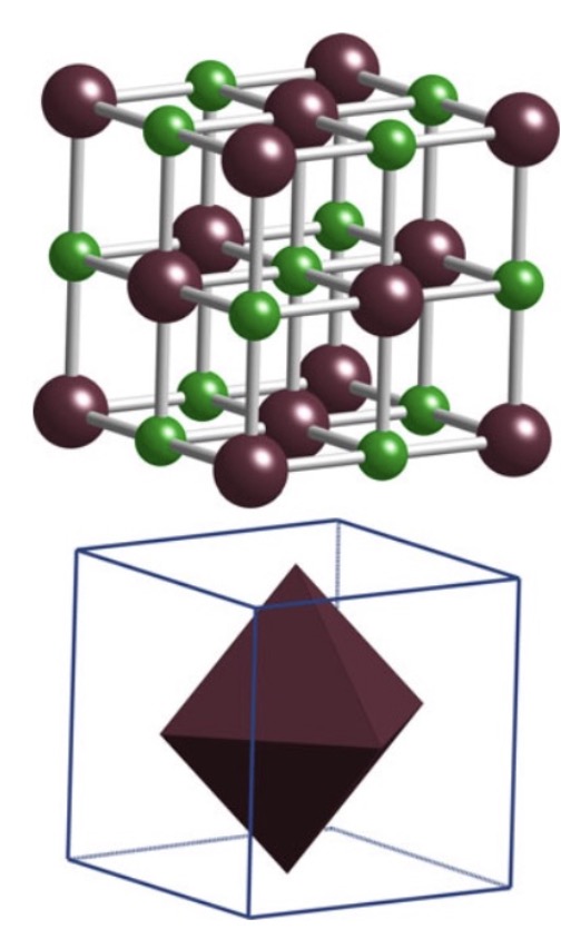 Structure: fcc anion arrangement; cations fill all octahedral interstices; CN = 6 for both ions