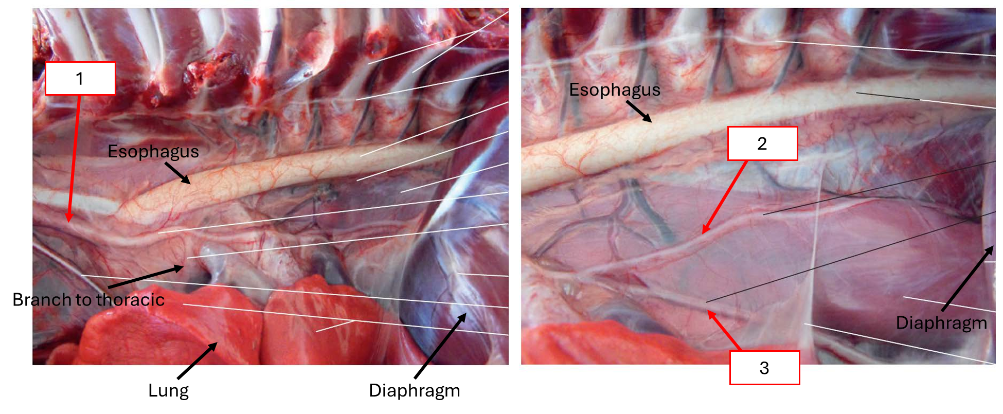 CNX ส่งใยประสาทออกจาก Brain stem -> ไปยังบริเวณคอแยกเป็นฝั่ง ซ้าย-ขวา -> แตกแขนงไปเลี้ยงส่วน Thoracic บางส่วน -> ที่เหลือเดินทางไปต่อ -> และแตกเป็น 2 ทางคือ DVB และ VVB -> พอไปถึง Esophagus DVB ทั้งสองฝั่งรวมกันเป็น DVT (VVB ด้วย เช่นกัน) -> DVT และ VVT จะไปยัง Diaphragm -> ไปเลี้ยงอวัยวะภายในช่องท้อง