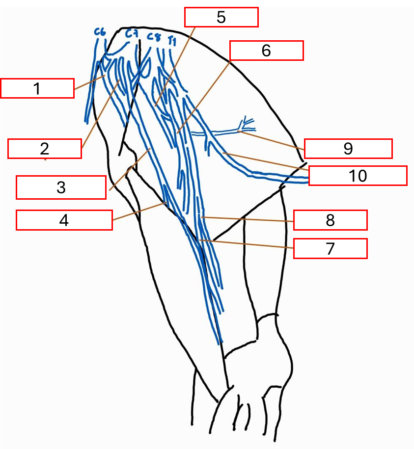 Musculocutaneous nerve เลี้ยงกล้ามเนื้อ flexorข้อศอก, รับความรู้สึกผิวหนังด้านใน