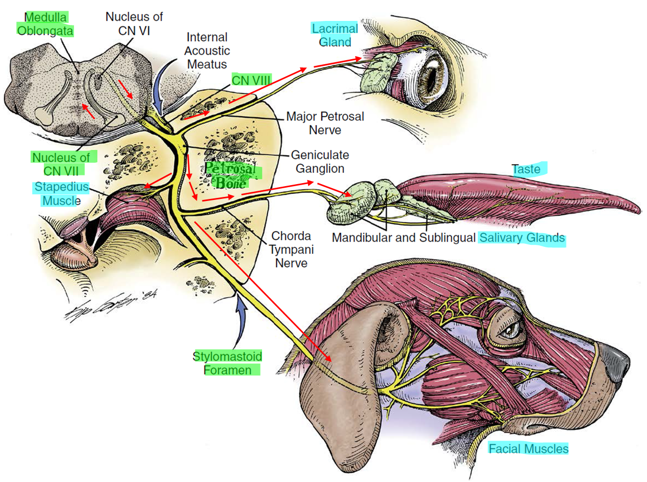 ไปเลี้ยง : ต่อมน้ำตา, กล้ามเนื้อ stapedius, ต่อมน้ำลาย, เส้นใยรับรส