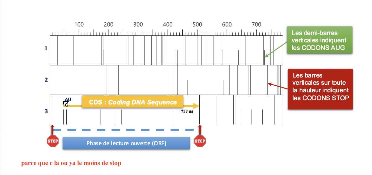 def Phase de lecture ouverte (ORF, Open Reading Frame) : séquence nucléotidique multiple de trois bases qui sépare deux