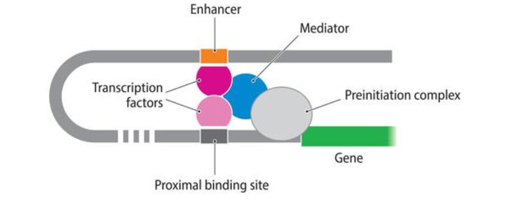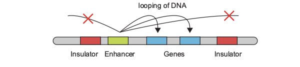 def enhancers : régions de l'ADN sur lesquelles se fixent des facteurs de transcription pour activer la transcription de gène(s). Ils agissent en cis et peuvent être situés jusqu'à 1 million de paires de bases (en amont ou en aval) des gènes régulés.