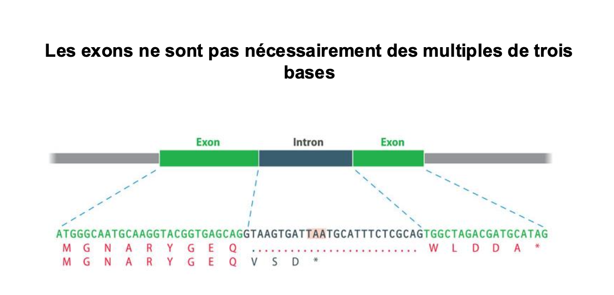 qu’ets ce qu’un exon? partie du gène qui persiste lors de la maturation (épissage) du transcrit primaire en ARNm. On dénombre plus de 500 000 exons dans les gènes codants les protéines. les exons ne sont pas particulierement des multiples de trois, des mutations atteignat l"‘epissage peuvente decaler le cadre de lecture.