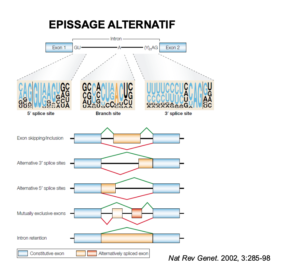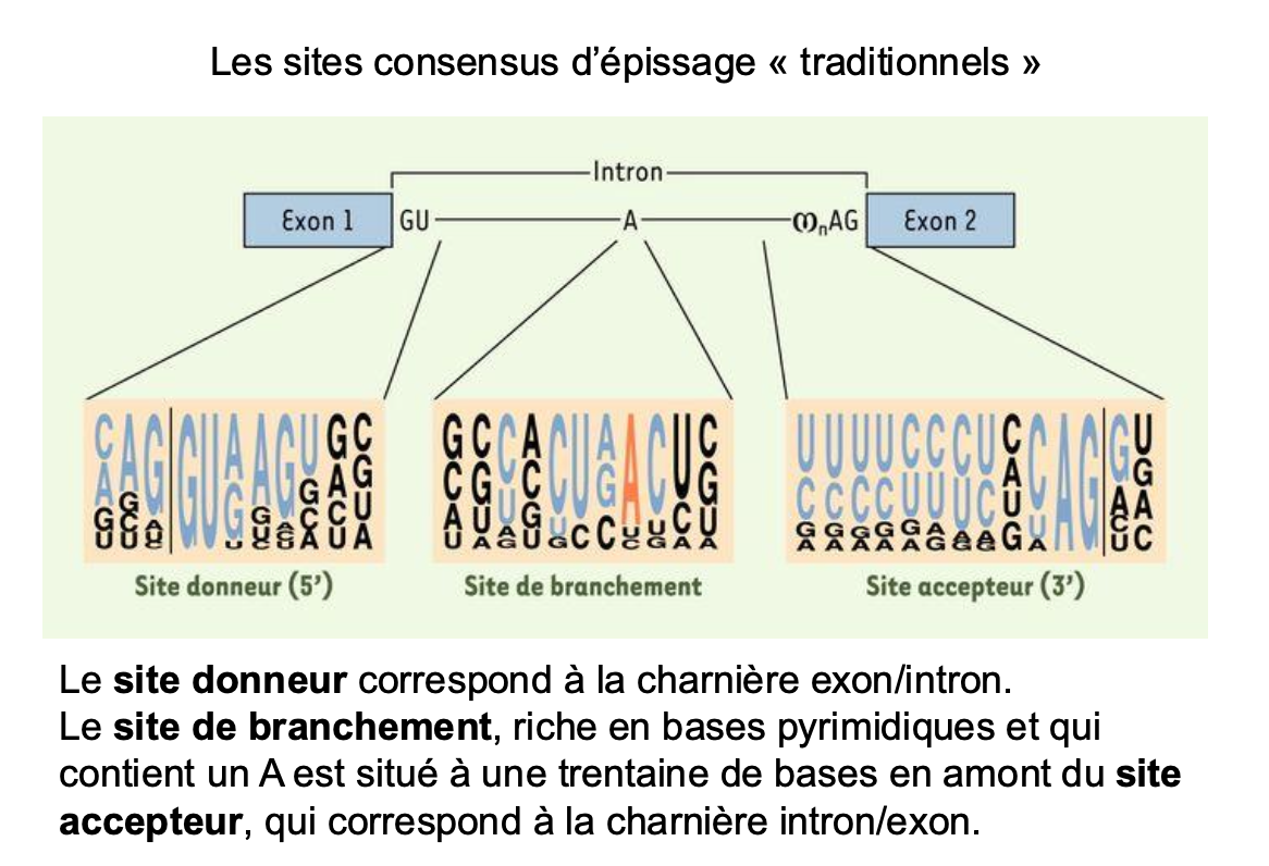 SEQUENCES CONSENSUS : séquences nucléotidiques impliquées dans des fonctions semblables et ne présentant entre elles que quelques variations de séquence nucléotidique. ex: TATA box, le gt (site d’epissage 5’), et ag (site d’epissage 3’), sequence kozak (codon dinitiation de la trad pour le ribosome)