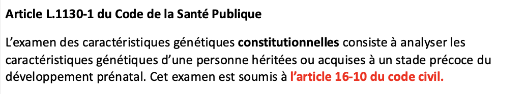 Que dit le code de la santé p!ublique, code civil, sur le consentement lors l’examen des caracteristique genetiques constitutiinelles?
