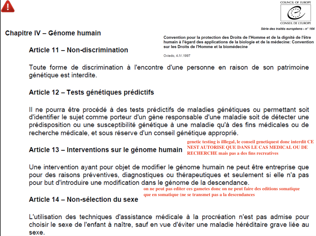 Quelle est le seul encadrement reglementaire autour de l’étude genetique bioethique? Quelle convention contraint la bioetique et de quelle loi s’inspire telle? quest ce qu un ogem (organisme gene etc)