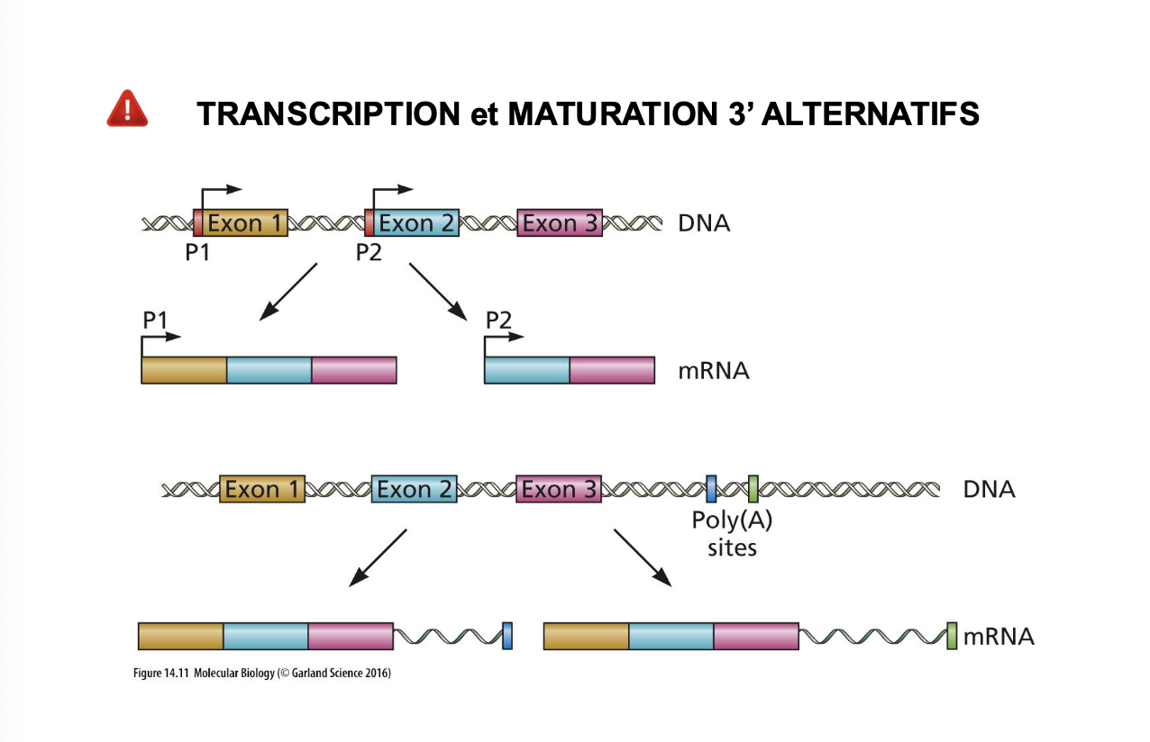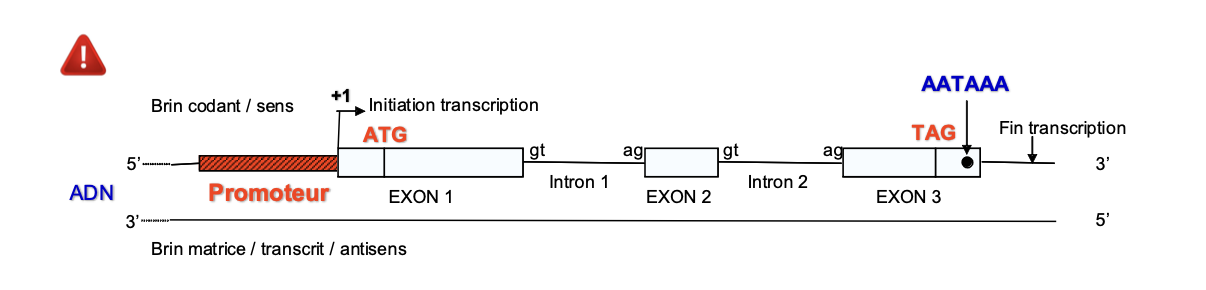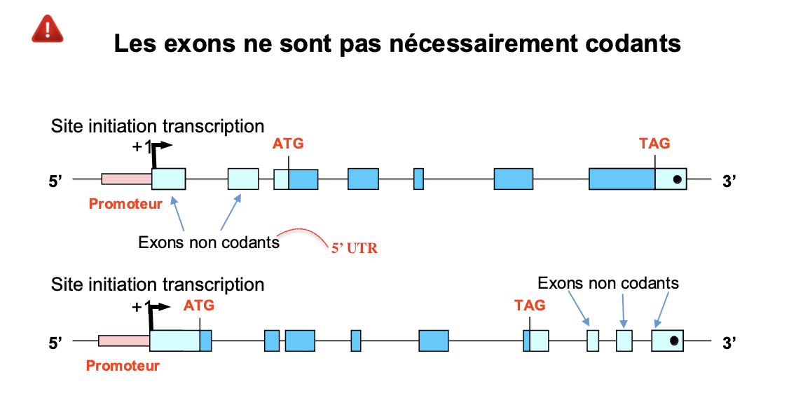 ATG ->Meth (AA qui initie la traduction) qui peut etre dans lexon un ou deux (dans ce cas il y a une UTRs→ sert a la regulation et stabilite de l’arn m) la queue poly A est ajoutée lors de la maturation de l’arn messager.