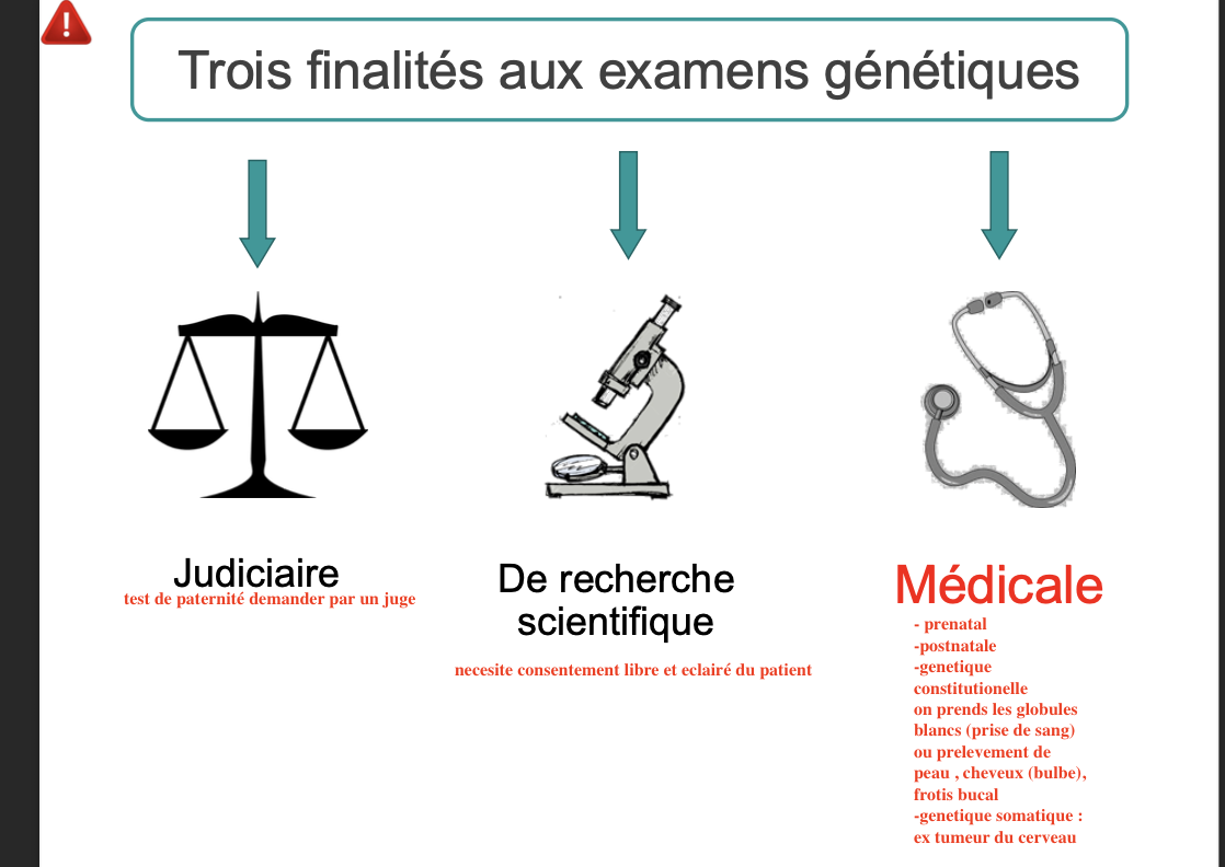 code civil: la personne par ecrit doit consentir a ce test ce consentement repose sur sa connaisance du proczessus de lexamen , sa nature, l’indication de l’examen, de son objectif , de l’apparition de données incidentes (mutations trouvee dans un autre genes, lui demender si ils veut savoir si on les trouve, cependant si il refuse de savoir ces donnees il est responsable de les communiquer ou non aux autres. Le consentement est révocable en tout ou partie, sans forme et à tout moment.