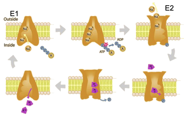 continuously pumps Na+ ions out of the cell, and K+ ions into the cell