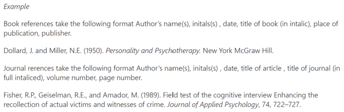 This section is a reference list. The full details of any journal articles, books and websites that you used in their report. Must follow a certain format. For example: