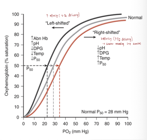 Describe the haemoglobin oxygen dissociation curve and explain the factors that cause it to shift to the right or left.