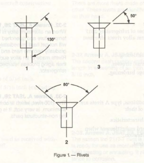 When a rivet has a 100° countersunk head, it has a head whose sides form a 100° angle. Drawing 1 shows a 260° angle, not including the rivet’s head. This leaves 100° for the head of the rivet.