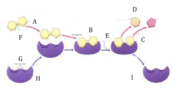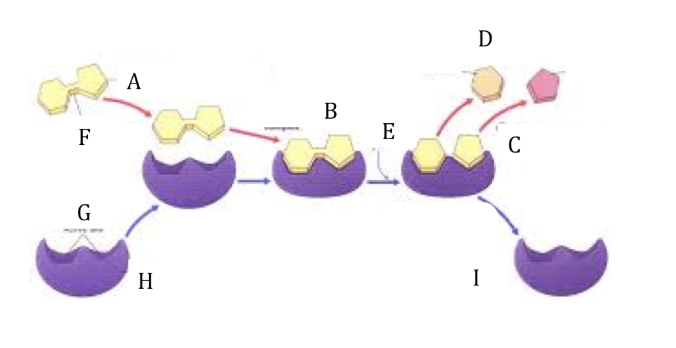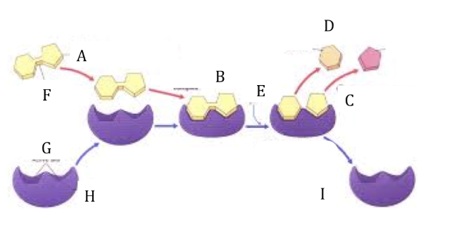 Refer to the lock and key diagram. What letter represents the enzyme substrate complex?