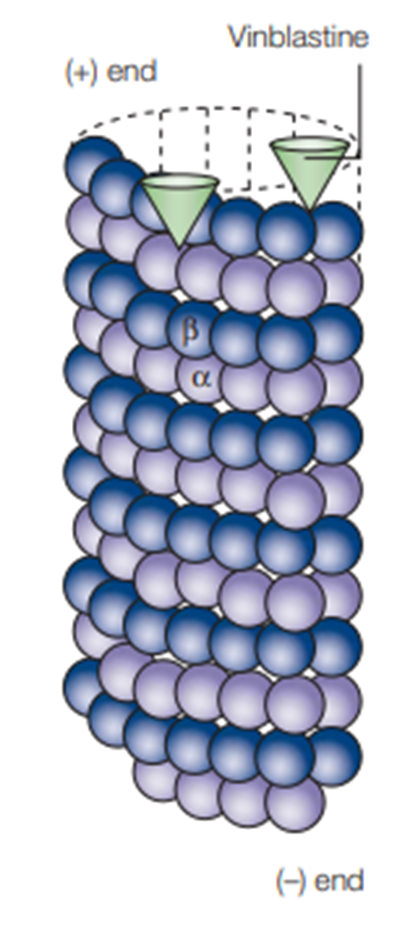 vinca alkaloids bind to the (+) end of existing microtubules and form a wedge that blocks new heterodimer addition, whereas colchicine binds to tubulin in the soluble pool first, locking it in a curved conformation that impairs polymerisation when incorporated into the microtubule.