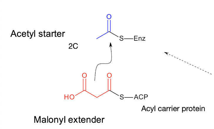 Acetyl CoA (the starter) and malonyl CoA (the extender).