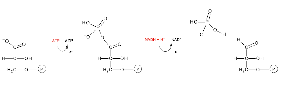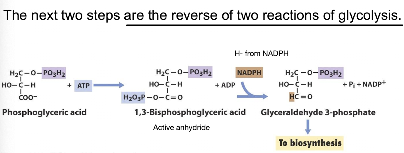 Reduction of 3-PG → 1,3-BPG → GA3P (reverse of GAPDH + PGK steps)